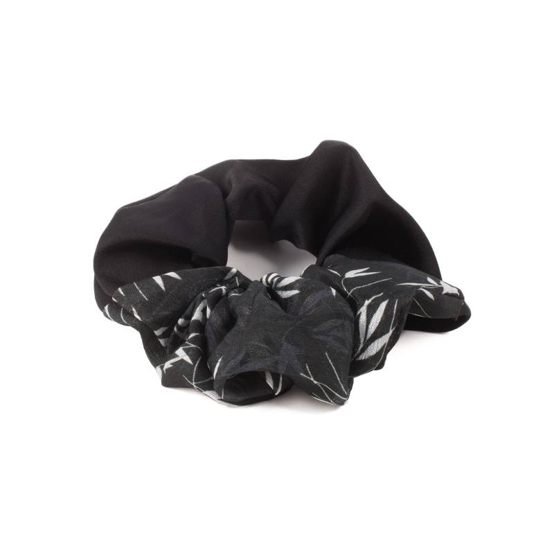 Φέρτε τη φυσική ομορφιά στα μαλλιά σας με αυτό το μοναδικό λαστιχάκι Scrunchie! Το μαύρο ύφασμα διακοσμείται με λευκά φύλλα, δημιουργώντας ένα chic και διαχρονικό αποτέλεσμα.