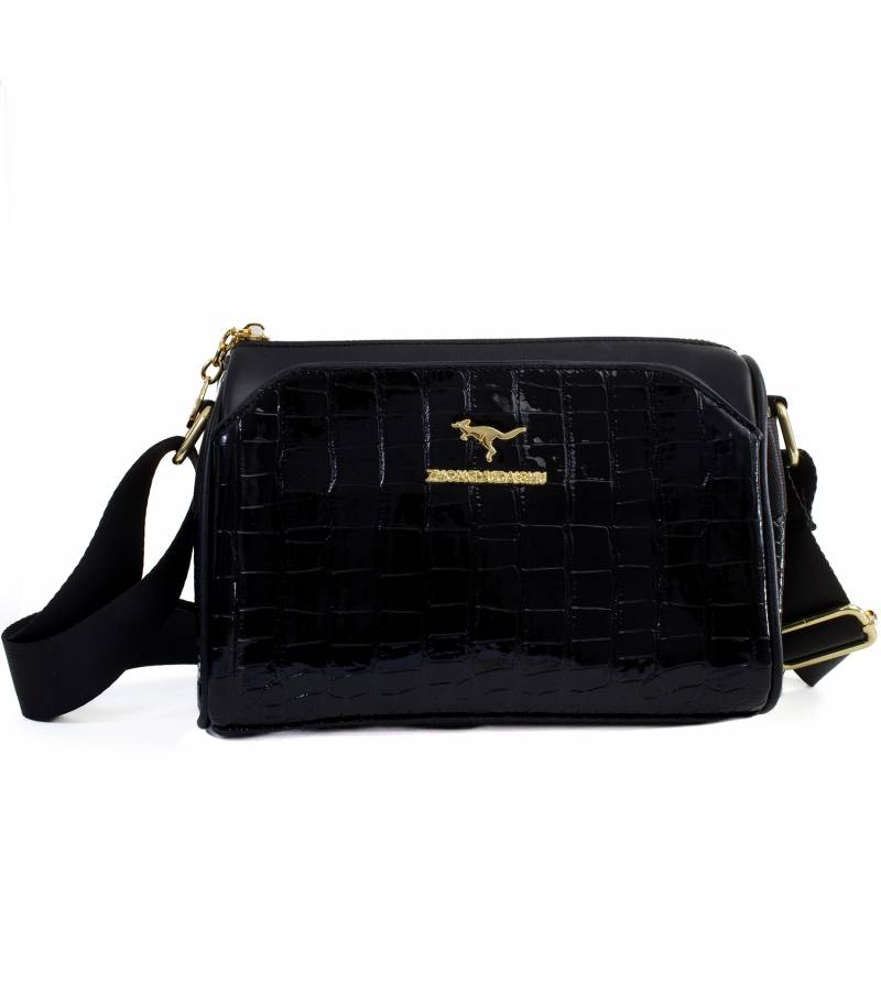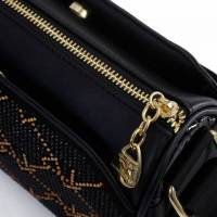 Αυτή η τσάντα σε μαύρο χρώμα με χρυσές λεπτομέρειες και μαύρο υφασμάτινο λουρί προσφέρει έναν συνδυασμό κομψότητας και άνεσης.