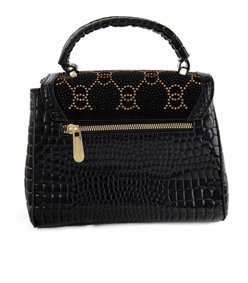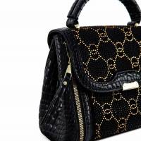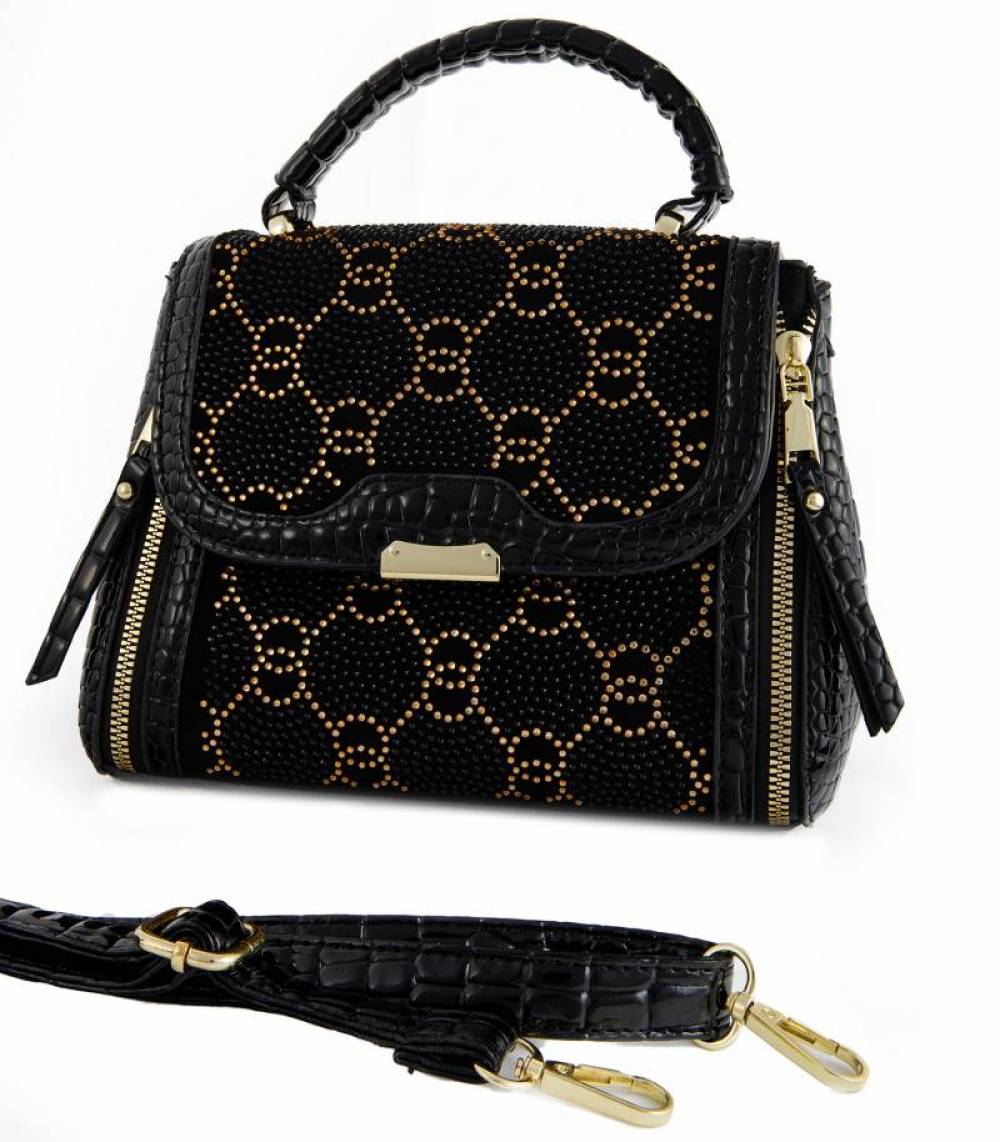 Αναδείξτε τα στυλ σας με αυτή την εντυπωσιακή τσάντα ώμου ή στο χέρι, σε μαύρο χρώμα, με χρυσές λεπτομέρειες και σχέδιο ρόμβοι.